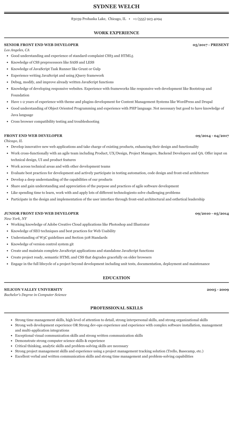 See more ideas about resume . Full stack web developer masters program: Create a front end web developer resume that works. Follow a step by step guide: Skills · tech degree in front end development · bachelor's degree in computer science · proficient in html5, css 3, javascript, ajax · well versed .